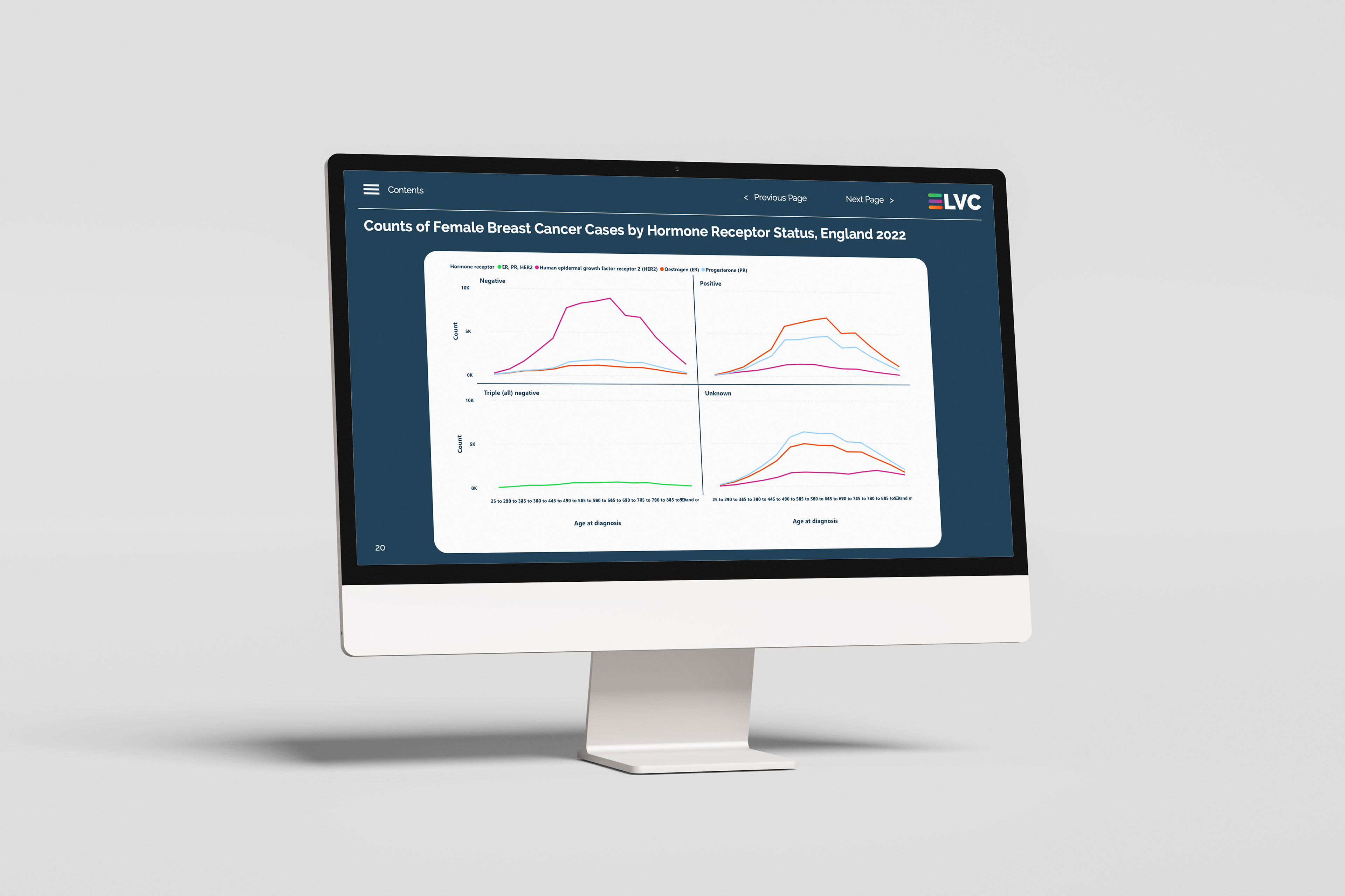 At LVC, we have developed the Breast Cancer Dashboard to support NHS professionals in evaluating health equity in breast cancer care. This interactive tool utilises publicly available data to present breast cancer case numbers and incidence rates, categorised by cancer stage, age group, and deprivation, at the Integrated Care Board (ICB) level. The insights derived from this dashboard can inform the development of policies and practices aimed at promoting equitable health outcomes.